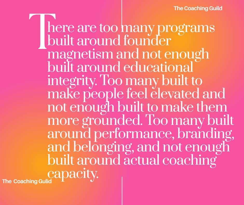 There are too many programs built around founder magnetism and not enough built around educational integrity. Too many built to make people feel elevated and not enough built to make them more grounded. Too many built around performance, branding, and belonging, and not enough built around actual coaching capacity.